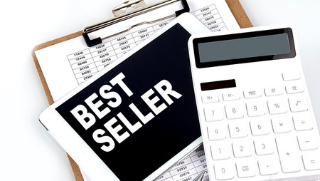 BEST SELLER text on tablet with chart, calculator and pen