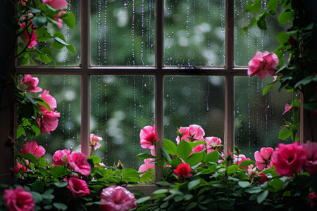 Charming window adorned with vibrant flowers, glistening with raindrops, evokes a sense of warmth and serenity