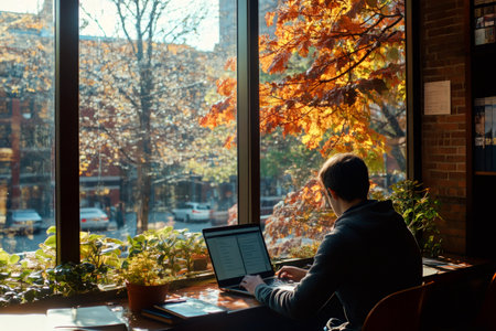 Young man working on a laptop in a library, appreciating the vibrant autumn foliage visible through the window, surrounded by books