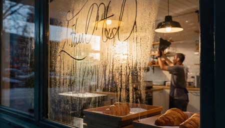 Fresh croissants in a bakery window with condensation and a baker working inside.
