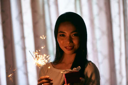 A girl in a white sweater holds a gift and sparkling sparklers. Holiday concept New Year or Christmas. Selective focus