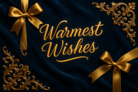 Warmest Wishes text with elegant golden ribbon on dark festive background