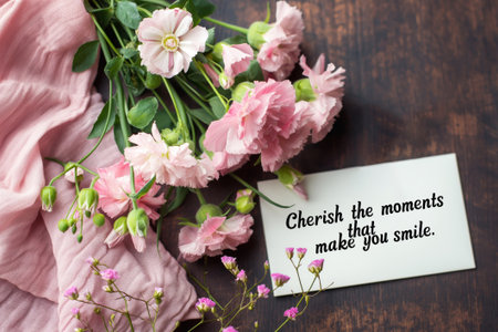 Beautiful greeting card with cherishing the moments that make you smile surrounded by fresh spring flowers on a wooden background