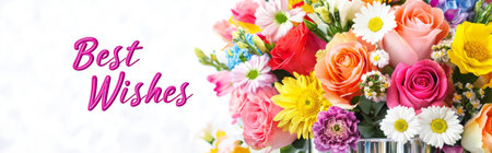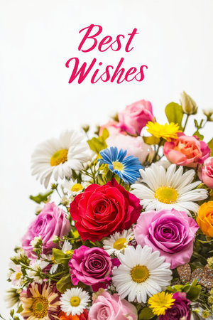 Bouquet of colorful flowers with text best wishes on white background, AI generated