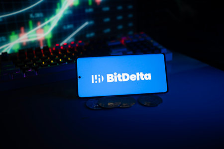 Dhaka, Bangladesh 18 September 2025:BitDelta logo presented with coins and trading charts in a neon blue setting