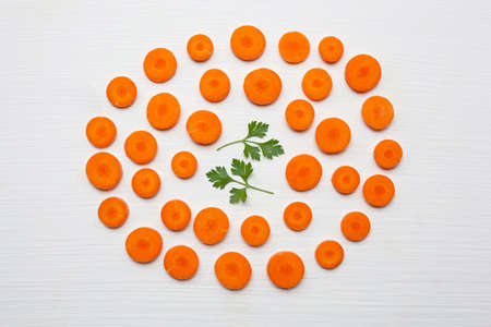 Chopped carrot slices with parsley leaves isolated on white background.