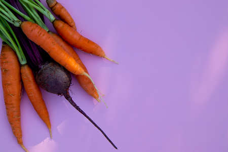 Top view of carrots and beets with stems and leaves on a pink background. The concept of seasonal vegetables and vegetable vegan vitamins