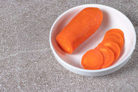 Boiled carrots, sliced in circles on a white plate.