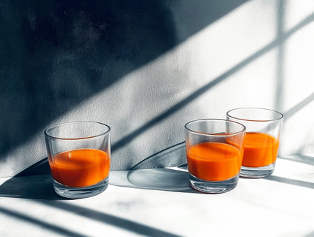 Minimalist still life of three glasses filled with vibrant orange juice casting dramatic shadows.