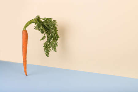 Carrot on pastel blue and yellow background. Minimal raw food concept. Spring minimal composition. Copy space
