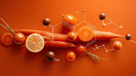 Captivating arrangement featuring carrot and lemon slices on an orange backdrop, intertwined with chemical structures representing nutrients and health benefits.
