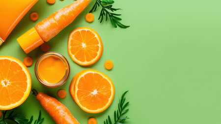A vibrant arrangement of fresh oranges and carrots on a green background, showcasing natural ingredients perfect for healthy meal preparations and juices.