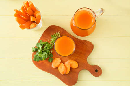 Glass of fresh carrot juice on wooden board