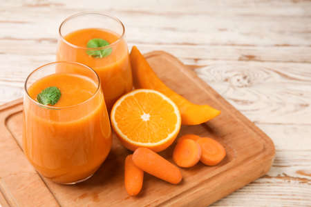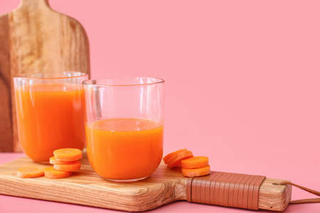 glasses of carrot juice and fresh carrots on wooden cutting board