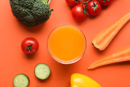 Glass of fresh carrot juice on color background