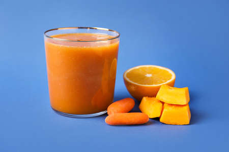glass of fresh carrot juice on blue wooden background with copy space