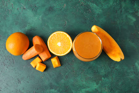 Glass of healthy smoothie and ingredients on color background