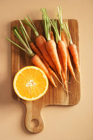 close-up of fresh carrots on wooden chopping board, concept of simple natural healthy ingredients