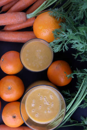 Carrots juice in glasses on dark stone background with raw and fresh carrots, copy space, close up