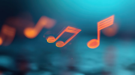 Capture the essence of music with this vibrant image of glowing notes in orange against a calming blue backdrop, perfect for creative and artistic projects.