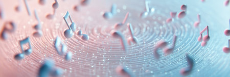 Colorful 3D music notes gently hover above rhythmic swirls, creating a dreamy atmosphere filled with vibrant hues and dynamic movement.