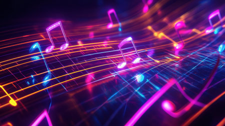 Explore a captivating display of glowing light trails depicting musical notes in vibrant motion. A stunning representation of creativity and rhythm.