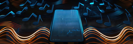 Music background. Mobile smartphone screen with music application, sound headphones. Audio voice with radio beats on black. Recording studio or podcasting banner with copy space