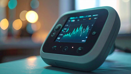 A medium closeup of a sleek futuristic ECG device resting on a soft fabric surface showcasing its vibrant display that highlights heart rate data and userfriendly interface