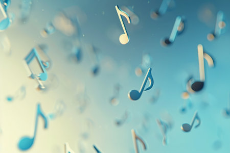3d render of music notes flying in the air against blue sky