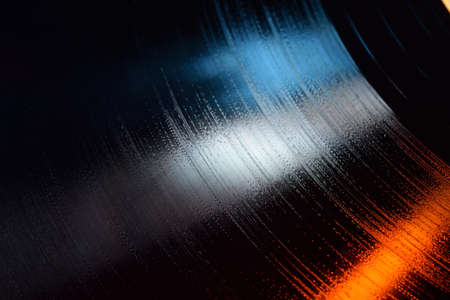Close-up shot of 12-inch LP vinyl record groove with blue and orange lights.