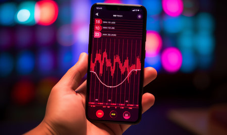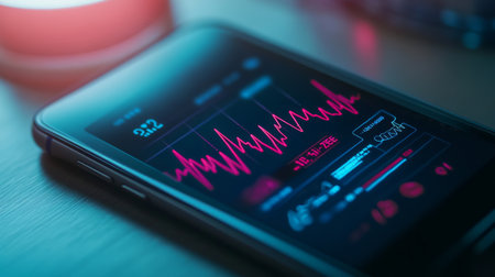 A close-up of a smartphone app displaying a heart rate monitor with a digital graph, capturing the convenience of tracking heartbeats using modern technology.