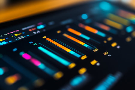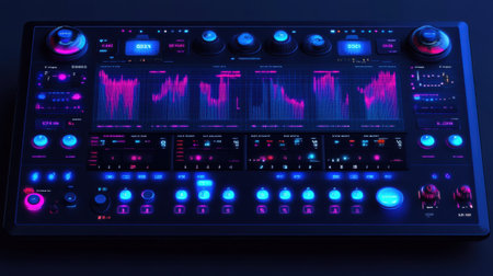 A vibrant control panel designed for audio mixing, featuring advanced LED displays and sleek buttons. Ideal for music production, sound design, and creative workflows.