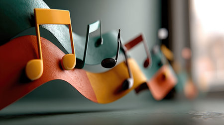 This vibrant image showcases colorful music notes flowing along a wavy surface, creating an inviting atmosphere filled with joy and creativity.
