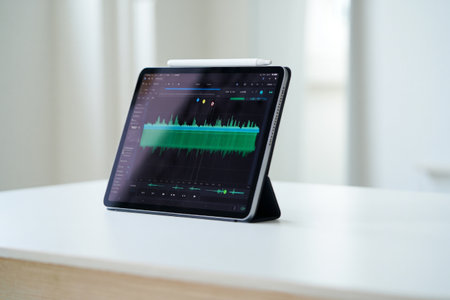 Ipad pro on desk. Audio production, graphic design and sound waves.