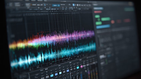 A digital recorder showcases vibrant waveforms that represent storytelling elements, illustrating the process of audio editing and creative sound design.