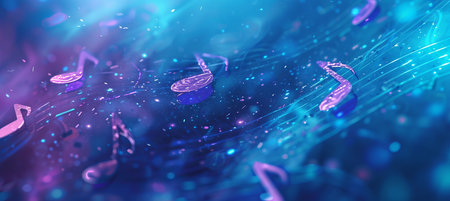 This image depicts a captivating flow of sheet music with shimmering notes and symbols, evoking the beauty and rhythm of musical expression.