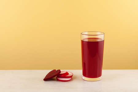 Salgam or fermented beet juice in tall grass. Turkish drink, made from fermented purple carrots, turnips or beets. Yellow background, copy space.