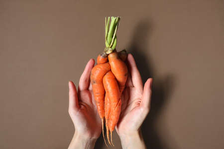 Ugly vegetable. Two female hands hold fused orange carrot. Autumn harvest, natural organic food, farm product. Horizontal banner, poster with copy space, brown background. Flat lay, dark shadow
