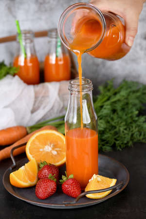 Detox drink. Freshly made Carrot Strawberry Orange Juice. For those who monitor their health