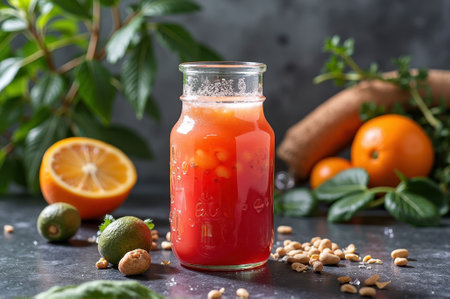 Fresh tropical fruit juice with citrus and nuts in a glass jar. That the image is generated using AI.