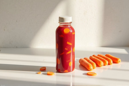 Fresh carrot infused beetroot juice in sunlit bottle on white surface. That the image is generated using AI.