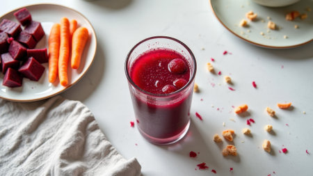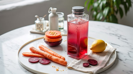 Fresh beetroot and carrot juice with sliced vegetables on marble countertop. That the image is generated using AI.