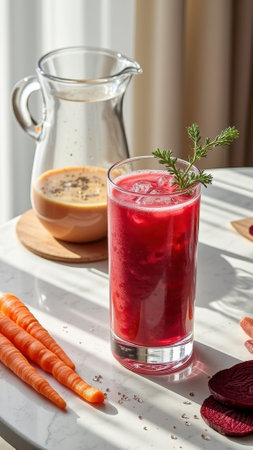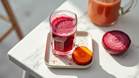 Fresh beetroot and carrot juice on sunlit marble table. That the image is generated using AI.