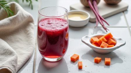 Fresh beetroot and carrot juice with chopped carrots on a clean white surface. That the image is generated using AI.