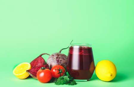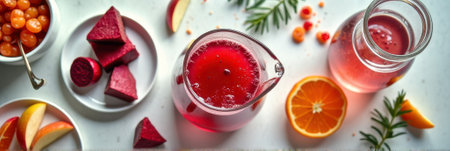 Freshly squeezed beetroot and citrus juice with assorted fruits on a white background. That the image is generated using AI.