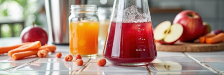 Fresh juices and sliced fruits on a kitchen counter with carrots and apples. That the image is generated using AI.