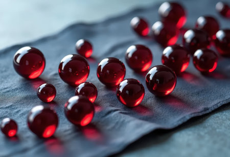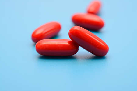 Heap of red pills on colored background. Tablets scattered on a table. Pile of red soft gelatin capsule. Vitamins and dietary supplements concept.
