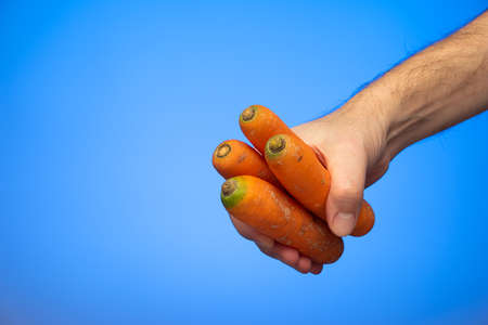 Bunch of fresh whole raw carrots held in hand by Caucasian male hand isolated on blue background.