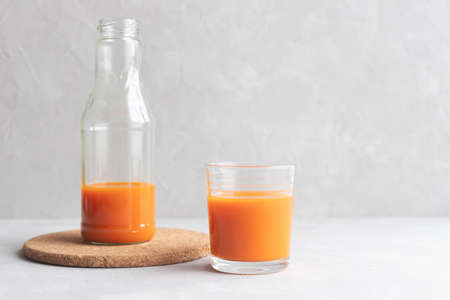 Glass bottle with carrot juice and a glass of juice stand next to a gray background. A healthy diet. Fresh Juice. Copy space.