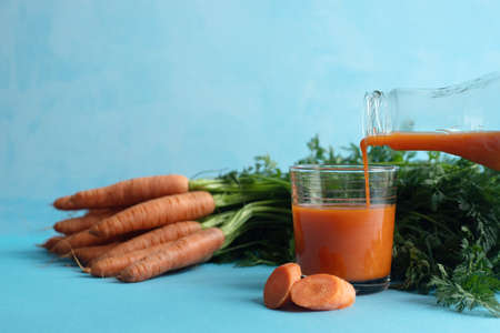 Carrot juice is poured from a bottle into a glass and carrots with tops are in the background. Blue background. Place for text.
